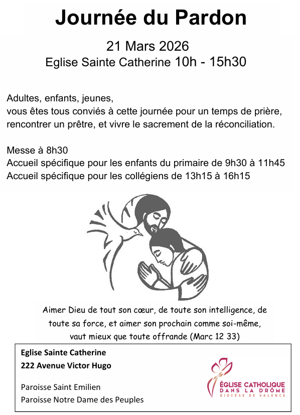 Journée du pardon 12.03.2026 Partager sur Twitter Partager sur Facebook Une journée ouverte à tous ! En cette période de carême, la paroisse st Emilien vous propose une journée du pardon, ouverte à tous.Messe à 8h30 puis, toute la journée, des prêtres vous accueillent à l’église ste Catherine pour vous confesser :– 10h-12h = adultes + accueil des primaires– 12h-13h30 = permanence pour les adultes– 13h30-15h30 = adultes + accueil des collégiens Venez nombreux !