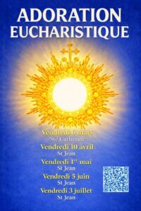1er vendredi du mois, nuit d’adoration 20h à 8h à St-Jean l’été, à Ste Catherine l’hiver (inscription via whatsapp, contacter le secrétariat pour rejoindre le groupe).