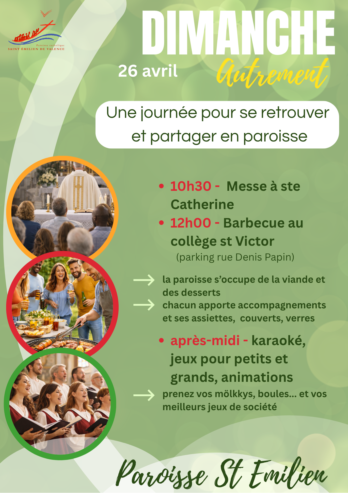 Deux fois par an, la paroisse st Emilien se retrouve au grand complet pour vivre un moment de fraternité: le dimanche de la rentrée paroissiale (13 septembre 2026) et notre dimanche autrement.